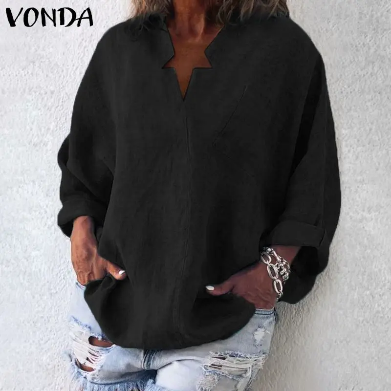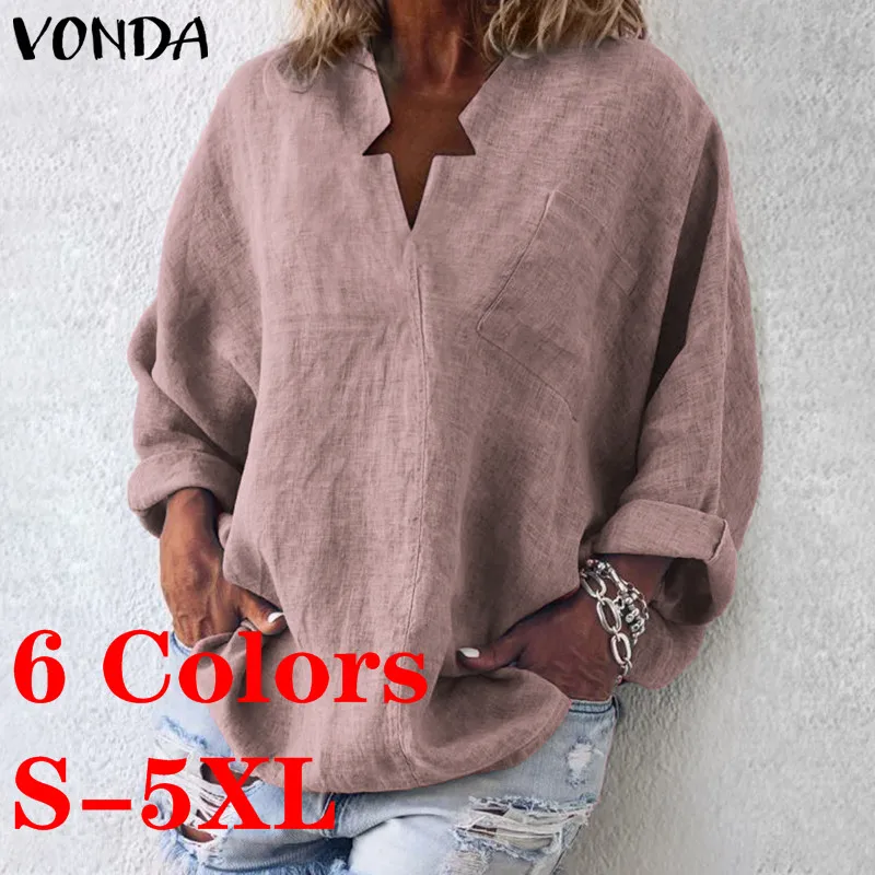wonderful VONDA 6 Colors Women Vintage Blouse Casual Shirt 2019 Autumn Long Sleeve V-Neck Tops OL Blusas Beac